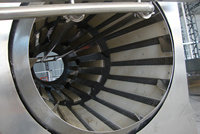 由電機帶動中間軸上的鏈輪旋轉從而帶動滾筒的旋轉,滾筒上有三個大法蘭,由六個托輪支撐,滾筒速度可由電機作調整。滾筒內壁裝有導料長條,滾筒內有噴淋水管,下方有兩個水箱,進料方噴淋管的水來自出料邊水箱,此水采用循環水;出料處的噴淋水來自進料邊的水箱,此水是清水。